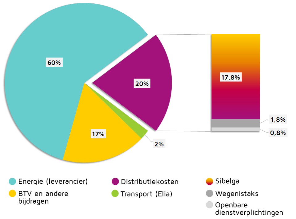 De distributiekost die je op je factuur terugvindt omvat niet alleen de werkelijke distributiekost, maar ook nog andere kosten die Sibelga dient te innen en door te storten naar de betrokken partijen.